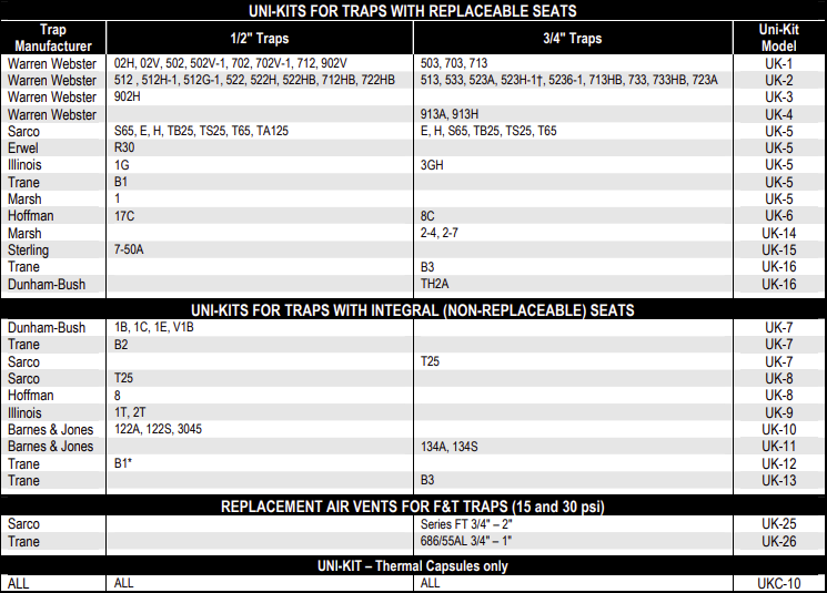 The COLTON ‘Uni-Kit’ Series universal repair kits are designed to fit a wide variety of makes and models of low pressure thermostatic radiator steam traps for up to 30 psig saturated steam service.